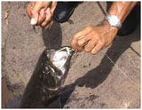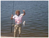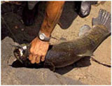 Vandaag vertrekken we naar Blanche Marie en de Nickerie rivier, een trip van 8/9 uur met de wagen over grotendeels zandwegen. Onderweg zie je niet anders dan oerwoud met sporadisch enkele dorpjes. Deze zijn vaak niet meer dan enkele bouwvallige hutten naast de weg. Verder zo nu en dan een kreek en een rivier, vaak met bruggen in een voor ons bedenkelijke staat. Een mooie maar vermoeiende trip door het continu heen en weer slingeren in de wagen. Maar uiteindelijk komen we om ongeveer 15 uur aan in de Lodge van Blanche Marie. Het geheel ziet eruit als een aaneengeknutseld geheel van kleinere gebouwen. De kamers zijn echter proper met een gezamenlijk toilet en douche even buiten de kamer. Het uitzicht over de rivier is er prachtig, en na het uitpakken staan we dan ook enkele minuten later aan het water met een spinhengel. Ik krijg er enkele beten, meestal vlak na het inwerpen tegen de overkant. Het lukt me echter niet om ook maar een vis te landen, ze weten zich allen met veel capriolen uit het water los te schudden. Veel tijd hebben we echter niet, want Norman neemt ons mee naar de watervallen. Hier vissen we op Anjoumara, een prehistorische uitziende vis, met een gevaarlijk gebit. De meeste vissen hier hebben trouwens altijd wel gevaarlijke tanden, stekels of iets anders, minder aangenaam om mee kennis te maken. Omdat er hier volop takken op de bodem liggen vissen we met dobbers. (ook al iets dat we niet bij hadden), met als aas stukken vis. Norman vangt binnen enkele minuten zijn eerste vis. Een Anjoumara van ruim 4 kg. In totaal wist Norman drie vissen te landen die avond. Dat was trouwens typisch voor Norman, hij toonde u hoe te vissen door steeds de eerste vis weg te vangen. Probeerde hij een nieuwe plaats, dan zij hij: ik kijk eerst even of ze er zitten, waarna hij een vis ving en wij daarna mochten proberen of er nog meerdere waren. Later sprak ik hem er over aan, maar hij hing er niet echt op in , met als resultaat dat ik daarna steeds probeerde voor Norman in te leggen, waarvoor je soms enorm rap moest zijn. Zelf kreeg ik die avond twee beten, waarvan ik een vis verspeelde omdat ik hem uitdrilde en daarna over de rotsen moest binnentakelen, en hij alsnog wist te ontsnappen. De tweede was iets makkelijker te landen omdat ik op dat moment plat op de oever stond. Beiden waren ongeveer identiek van gewicht : circa 4 kg. De anjoumare is een felle vechter die door springen en schudden met het hoofd meer dan eens de haak loskrijgt. De enige manier om dit niet tegen te komen, is hem zoals Norman doet, met zwaar materiaal binnen takelen, maar daar moet je dan ook zelf voor kiezen. Aan mij is deze manier niet echt besteed, maar het is wel het effectiefst. Helmut mist zijn eerste vis, en krijgt daarna geregeld beet van een sidderaal die een mooi rondje uit zijn aasvis eet, maar niet te vangen is aan deze grote haken. Als het begint te schemeren stoppen we met vissen, en keren terug voor het avondmaal dat door Norman bereid wordt. Na het eten kunnen we het niet laten om nogmaals naar de rivier te trekken. Achter de laatste hut van de lodge is een iets diepere plaats in de rivier, en gewapend met een olielamp en hoofdlampen, willen we hier nog enkele uren vissen. Zelf probeer ik het met kunstaas, maar dat blijkt in het donker niet goed te werken. bij de twee beten die ik kreeg was ik steeds te laat met aanslaan. Helmut start met een dobber, en ook dat werkte niet bij gebrek aan licht. Daarna koos hij voor een schuiflood op de bodem. Nu kreeg hij wel geregeld beet, maar ondanks de stalen onderlijn werd deze keer op keer overgebeten. Met veel moeite lukte het ons toch, door vlug aan te slaan, een vis te landen. Het was een Piranha van ruim 1 kg, niet verwonderlijk dat onze toch dunne stalen onderlijnen overgebeten werden, zeker als je het gebit van zo'n kereltje bekijkt. Om 1 uur kregen we problemen met onze lampen, zodat we verplicht waren te stoppen, en niet verder konden experimenteren.
