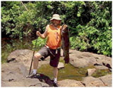 Vandaag gaan we met een Kano de rivier stroomafwaarts af. Een kleine motor van 5 PK moet ons de terugweg iets gemakkelijker maken. Als we de boot zien, hebben we onze bedenkingen over de stabiliteit. Vissen vanaf de boot is reeds bij voorbaat uitgesloten. In laatste instantie besluit ik nog de bagage in een plastiekzak te stoppen, wat achteraf een goed idee bleek te zijn. De rivier is hier afwisselend ondiep met kleine stroomversnellingen, waarbij we soms uit de boot moeten om deze over de rotsen te krijgen, en andere rustig stromende diepere gedeelten. Bij de derde stroomversnelling loopt het echter al mis. De houten kano gaat plots verkeerd door een stroomversnelling waarbij de neus van de boot in de takken en bomen van de oever vast komt te zitten. Voor een van mijn hengels is dit catastrofaal en breekt de top af. Ondertussen krijgt de stroom greep op de schuin liggende boot en duwt deze in enkele seconden onderwater. Terwijl Helmut de hengel tracht te redden, grijp ik de bagagezak en de overige hengels en aas, de boot onderwijl tegenhoudend met mijn lichaam. Met veel gevloek geraken we echter na een tijdje uit onze penibele situatie, en op het droge. Resultaat, een gebroken hengel, een doos met negen pluggen, ons rantsoen en een deel van de drank, en een machete kwijt. Gelukkig bleef onze camera droog, en was iedereen ongedeerd. Door dit ongeluk beperkten we onze trip dan ook door de rivier slechts nog enkele kilometer af te varen, over rustiger stroken weliswaar. Onze eerste en ook verste aanlegplaats was een brede rivierbocht. Vanaf de oever visten we in het diepere gedeelte van de buitenbocht. We deden dit zowel met dobber als schuiflood. Geregeld kregen we beet, maar het was niet de verwachte Anjoumara, maar Piranha die ons aas nam. Na enkele vissen besluit Norman daarom terug te varen. Stroomafwaarts de stroomversnelling waar onze boot zonk, proberen we het nogmaals. Ditmaal in een inham zijwaarts van de eigenlijke stroom. Vanaf enkele rotsen werpen we ons aas dicht tegen de oever aan met een dobber en het aas op een diepte van 1.5 meter. Het is terug Norman die de eerste beet krijgt, en een Anjoumara land van circa 4 kg. Ook helmut krijgt beet, maar weer weet de vis te ontsnappen, ditmaal door zich vast te zwemmen in stenen en struiken. Ik besluit daarop om de pin uit de dobber te verwijderen, en werp deze nu als schuifdobber midden in het rustig gedeelte. Zoals bijna steeds als er Anjoumara aanwezig is volgt de beet binnen vijf minuten. Ik laat de vis rustig het aas nemen, en sla pas aan als hij voor de tweede maal lijn neemt. Onmiddellijk na het zetten van de haak besef ik dat het hier een iets groter exemplaar betreft. De vis gaat enkele malen op hoge snelheid door de slip, de runs zijn aan de korte kant, maar enorm krachtig. Als de vis voor de eerste maal in al zijn glorie uit het water jumpt wil ik deze vis absoluut binnen halen. De slip wordt iets vaster gezet, waardoor de vis iets minder ruimte krijgt. Na enkele minuten en nog enkele vergeefse pogingen om de rotsen of de struiken te bereiken is het zover, ik bewonder deze mooie vechter op de kant. Precies 9.200 gram en 90 cm lang, een vis om U tegen te zeggen. Daarna proberen we nog een drietal andere plaatsen uit, maar de vissen willen niet meer. Om 14.30 uur leggen we terug aan bij de lodge. Norman wil om 16 uur nogmaals proberen bij de watervallen, Helmut gaat mee, maar ik besluit om zelf bij de lodge te vissen. De gemiste vissen van de vorige dag blijven me intrigeren, en ik wil beslist tonen dat het zo niet kan. Op mijn eerste worp zie ik een zwarte schim volgen, maar die mist de spinner. Tegen de verwachting in is het op een van de volgende worpen wel raak. Een kleine Anjoumara van circa 2 kg maakte het ondiepe water onveilig, en zag in mijn spinner een lekkere hap. Voor de volgende aanbeten moet ik wat geduld hebben, maar zo rond 17 uur krijg ik geregeld aanbeet. De vissen presteren het echter om zoals de vorige dag door jumpen het spinstangetje zodanig te verbuigen, dat de sluiting opengaat, en de vis met de spinner weet te ontsnappen. Ten einde raad besluit ik er een kleine drijvende plug (5cm) aan te knopen. Nu blijven de vissen wel aan de haak, en hoewel niet groot, circa 20cm zijn het fanatieke vechters. Norman noemde ze achteraf Moroko. Ik probeer enkele verschillende plugjes uit, en met allen weet ik wel een vis te vangen. Pas als het begint te schemeren valt de beet stil. Resultaat 6 vissen. Ondertussen zijn Helmut en Norman ook terug. De rivier bij de watervallen was door regen verderop echter fors gestegen, en de stroming maakte vissen daar onmogelijk. Uiteindelijk mocht ik dan ook blij zijn met mijn keuze die namiddag. Die avond bleven we wat napraten, waarbij we talrijke nieuwe ideeën opdeden voor misschien een volgende vistrip.