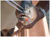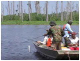 In Sep-Okt-Nov verzamelt een ander soort vis, de Kubi, zich op sommige diepere plaatsen in het meer. Norman neemt ons deze morgen dan ook mee naar een van die plaatsen. De diepte is er ongeveer 18 tot 30 meter, en de bodem zeer grillig. We vissen met het lood onderaan, en het aas, kleine visjes, aan een zijlijntje er boven. Het is terug Norman die een eerste mooi exemplaar van ruim 1kg weet te vangen. Onze vissen zijn echter nooit meer dan 25 cm groot, daarbij vangen we tussendoor geregeld kleine katvissen. Meer dan eens gebeurd het ook dat we van een gehaakte vis, bij het binnenhalen slechts de kop overhouden. De overal aanwezige piranha's zien in de gehaakte, weerloze vis vaak een gemakkelijke prooi. Na een tijd monteer ik een platvis onderlijn met verschillende afhoudertjes, waarvan ik er twee laat staan, en de rest verwijder. Met deze montage, waarbij ik nu twee aasvisjes monteer, komen de aanbeten ook dubbel zo vlug. Voordeel hiervan is, dat je bij een gemiste aanbeet, de lijn op diepte kunt laten, waarbij het tweede aasvisje zijn werk doet. Maar al bij al is het slechts een vrij doffe manier van vissen, en op de middag besluiten we dan ook om weer op Tukunari te vissen. De rest van de namiddag proberen we weer verschillende plaatsen uit, en overal weten we wel enkele exemplaren te vangen, maar nergens blijken ze massaal aanwezig te zijn. De laatste plaats die we aandoen is het eiland recht tegenover onze lodge. en hoewel Norman beweerde dat ze na 18 uur niet meer bijten, weet ik er hier in de schemering nog acht stuks te vangen. Resultaat van die namiddag, ik zeker ruim 20 stuks, Helmut en Norman iets minder, maar steeds wel iets grotere exemplaren.